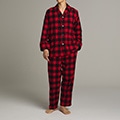オーガニックコットン100%による両面起毛のフランネル生地を使用した長袖パジャマセットです。ゆったりとしたサイズ感で、リラックスした着心地が特長。レッドベースのオーセンティックなバッファローチェック柄で、左胸のポケットの上にブラックで入れたブランドアイコンのポロプレイヤー刺繍とパイピングがデザインポイントです。